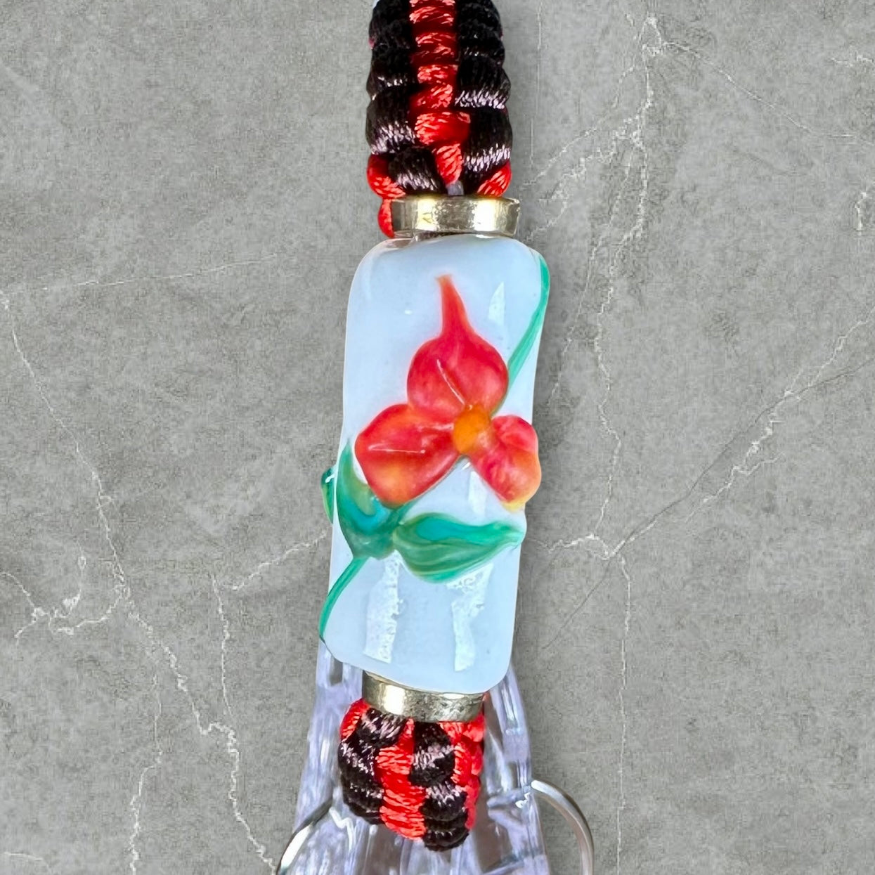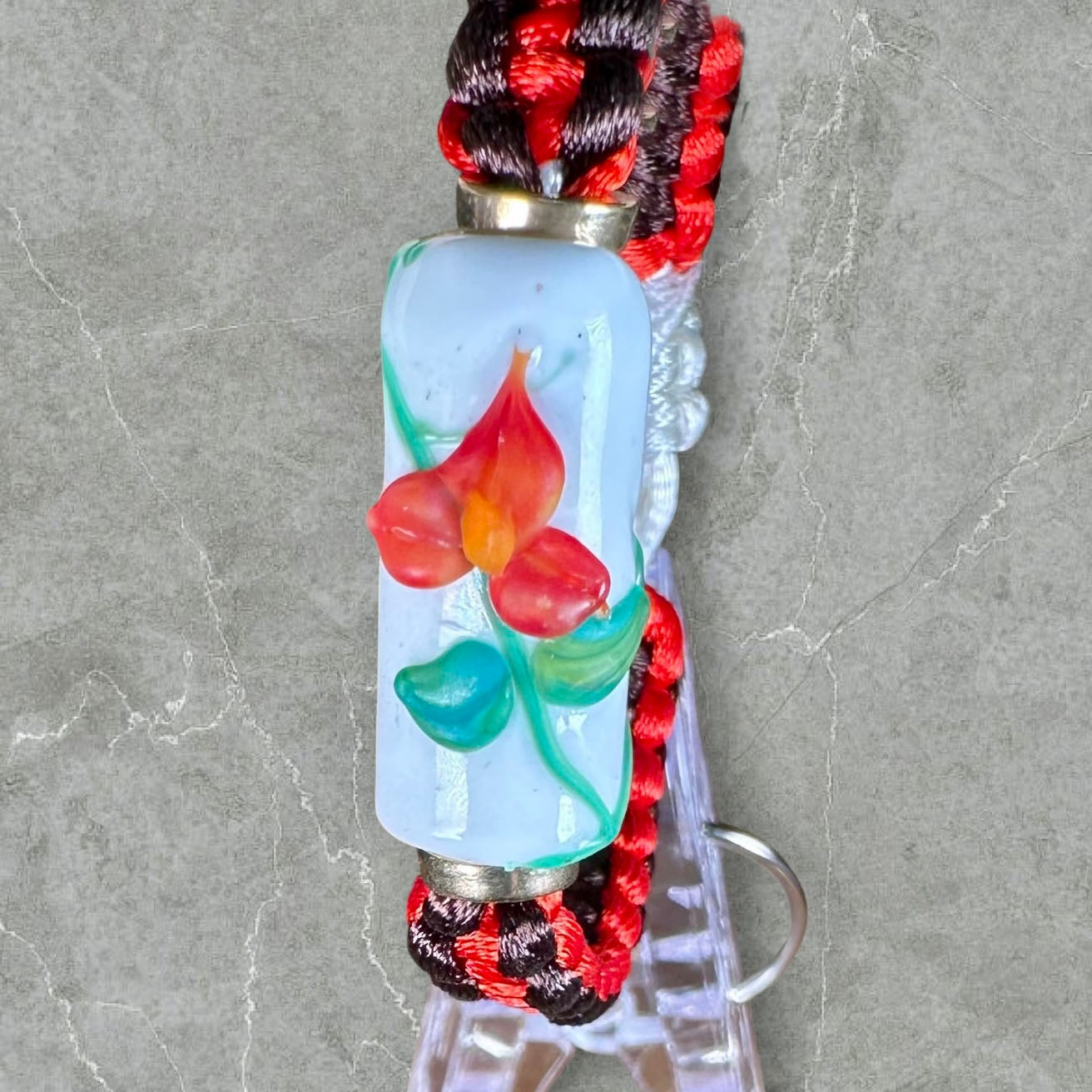 This handcrafted bracelet features a column-shaped glass bead adorned with a red flower design. The bead is elegantly strung on a braided nylon cord in red and brown. The bracelet's adjustable length, ranging from 6 to 7.5 inches, ensures a comfortable and secure fit for various wrist sizes.