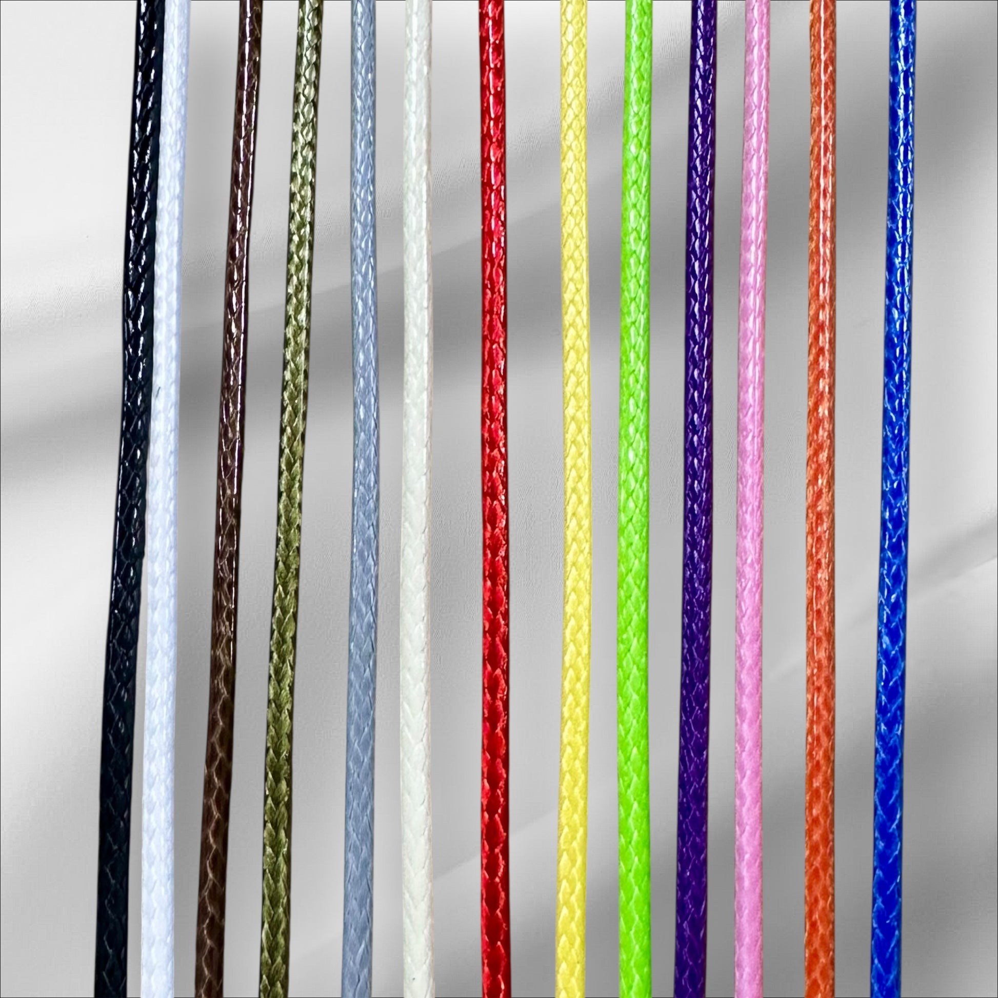 The wax cords are 18 inches in length with an additional 2-inch extender chain. The cords fasten with a lobster claw clasp.