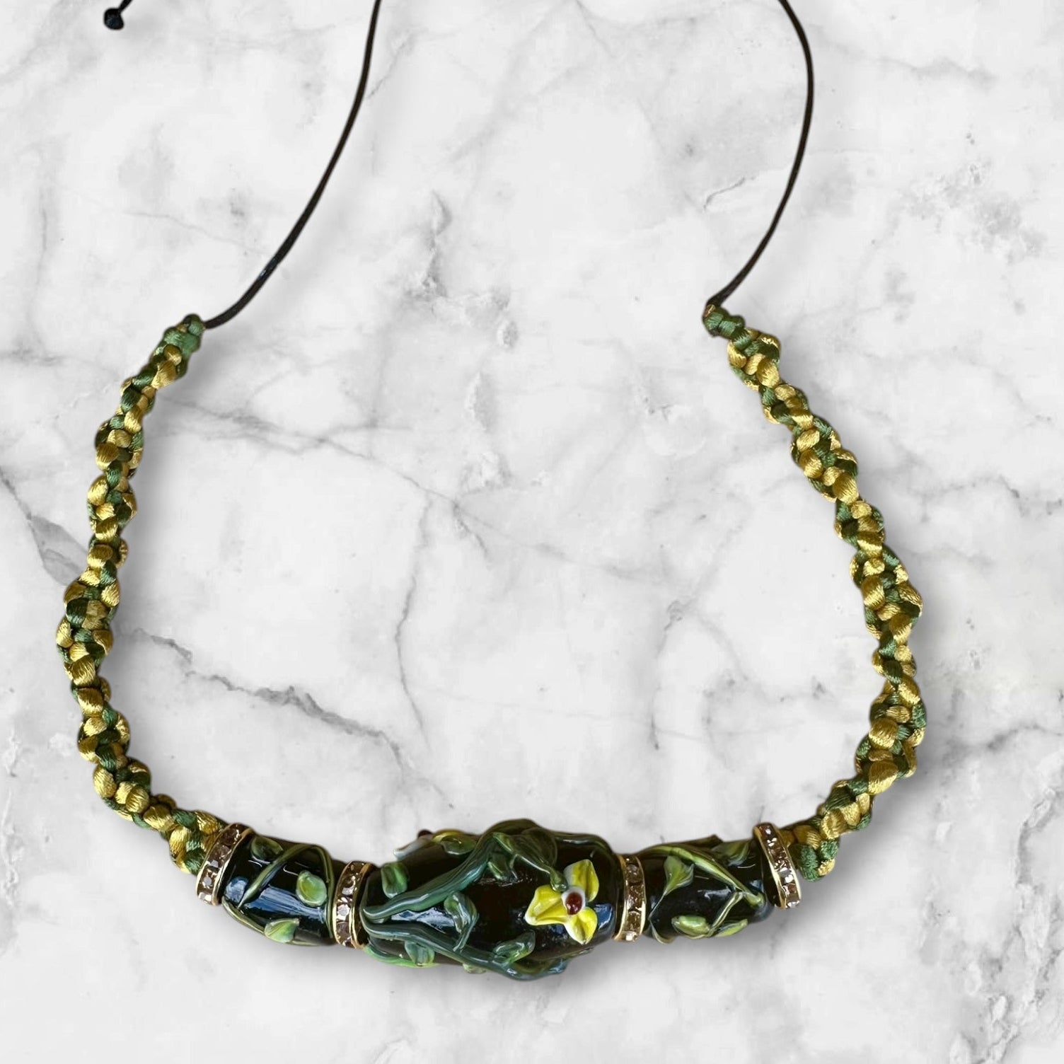 This handcrafted necklace features a flameworked glass bead adorned with yellow flowers and vines. The bead is elegantly strung on a braided nylon cord in a combination of yellow, green, and tan. The braided portion contains a flexible wire core, allowing you to gently shape it for a custom fit. Adjustable length up to 26 inches.