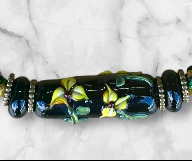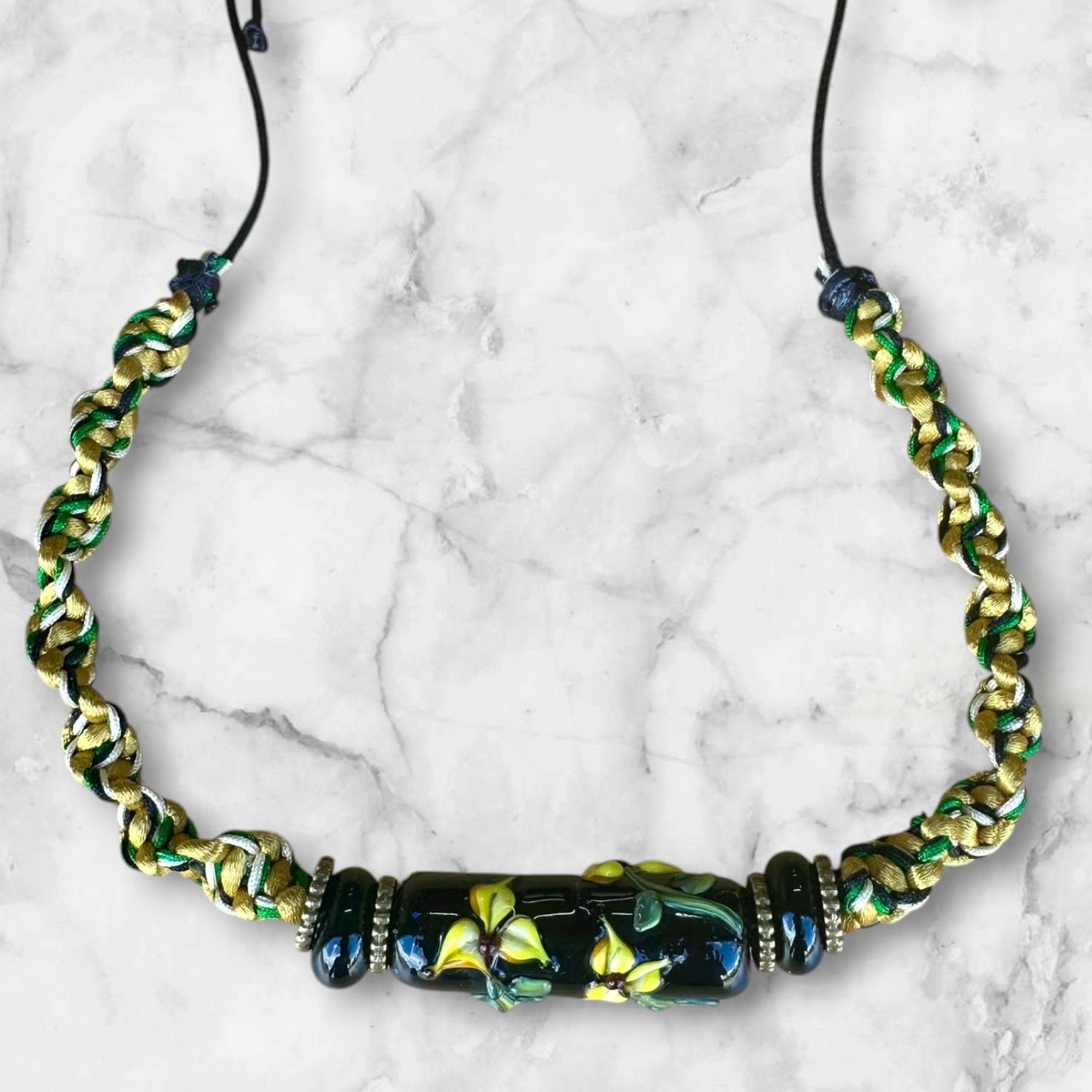 This handcrafted necklace features a flameworked glass bead adorned with yellow and tan flowers and vines. The bead is elegantly strung on a braided nylon cord in a combination of yellow, green, and tan. The braided portion contains a flexible wire core, allowing you to gently shape it for a custom fit. Adjustable length up to 26 inches.