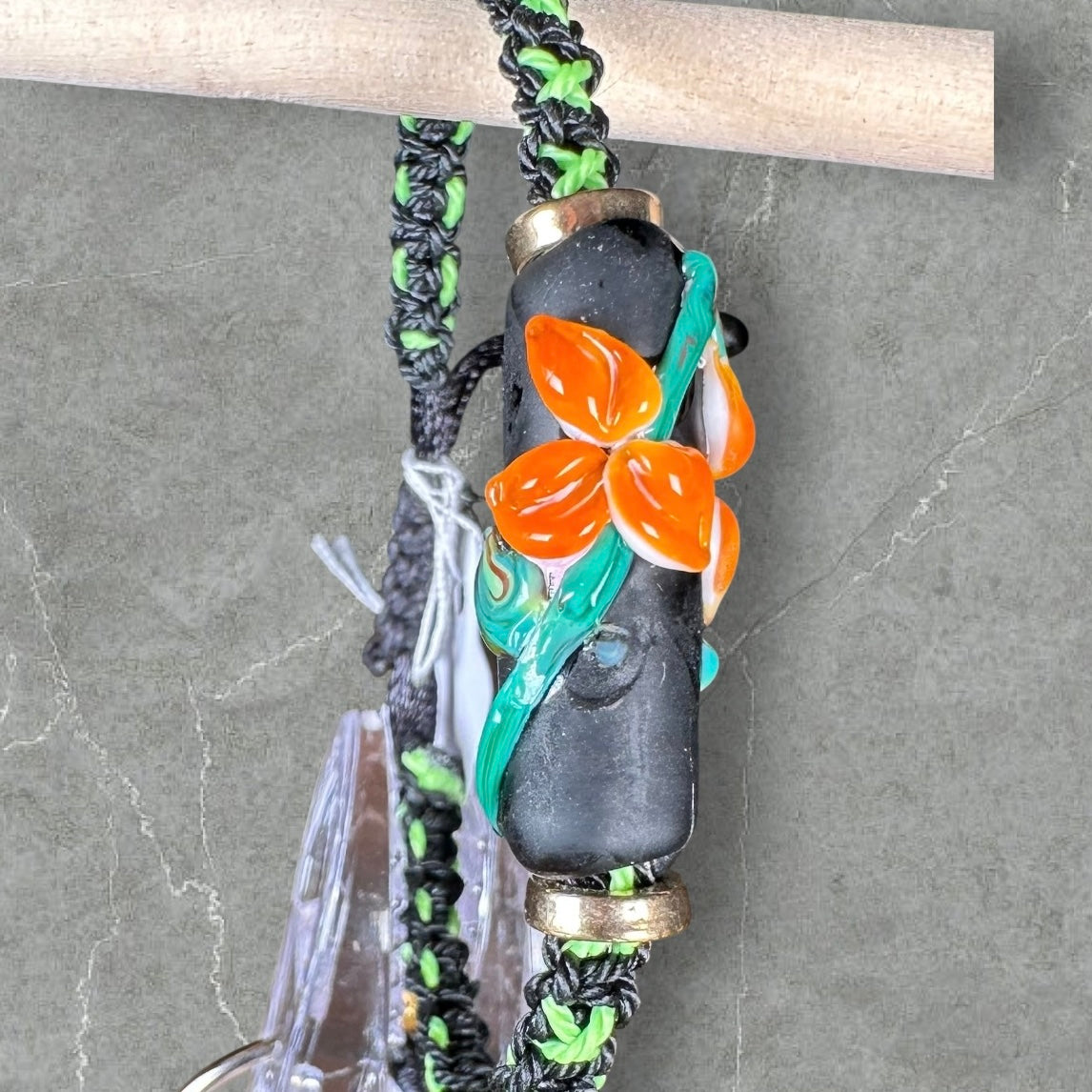 This handcrafted bracelet features a column-shaped glass bead adorned with an orange flower design on each side. The bead is elegantly strung on a braided wax cord in green and black. The bracelet's adjustable length, ranging from 6 to 7.5 inches, ensures a comfortable and secure fit for various wrist sizes.